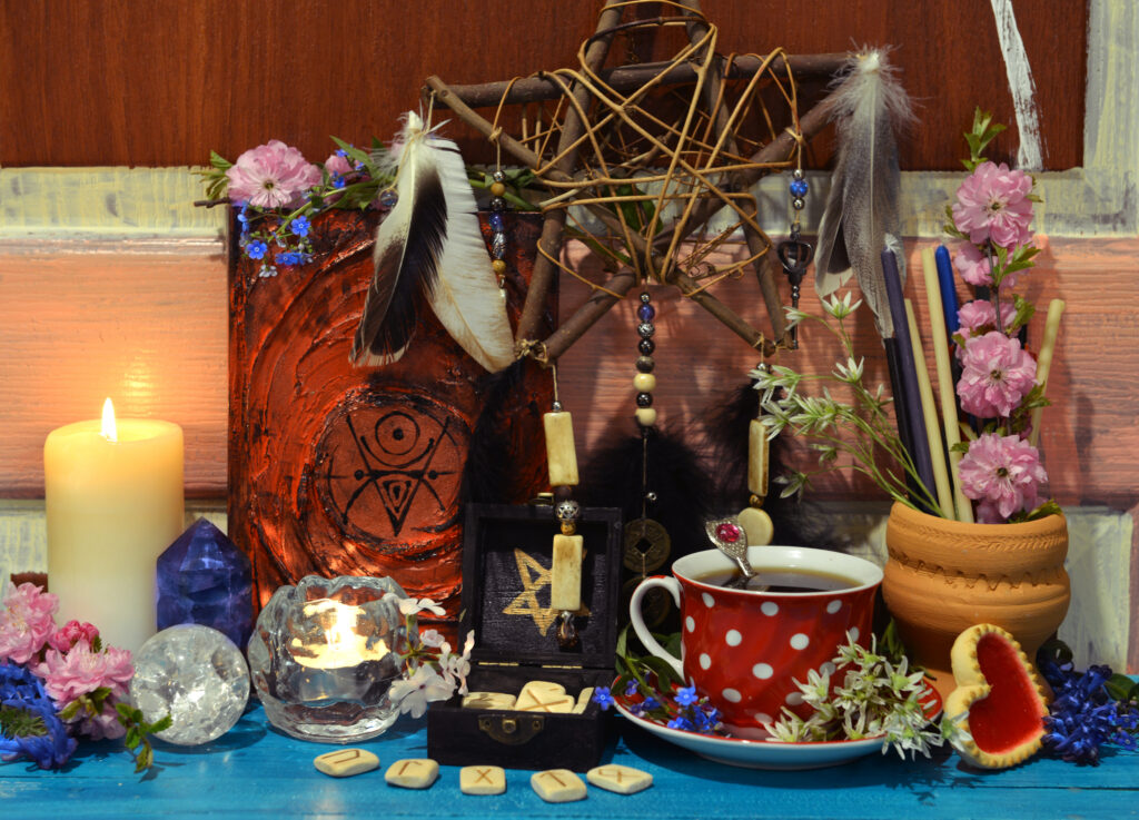 Magic book, pentagram and runes on witch altar table. Occult, esoteric and divination still life. Mystic background with vintage objects