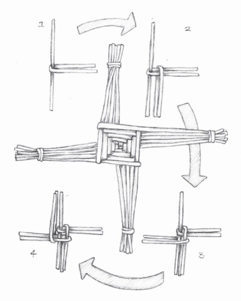 Zacznij od ułożenia pionowo jednego kawałka słomy na ręce. Na jego środku ułóż w pozycji poziomej drugi kawałek słomy, tworząc krzyżyk. Złóż na pół poziomy kawałek, a po prawej stronie złącz jego dwa końce. Obróć łodygi o ćwierć obrotu w górę, tak by ta ze złączonymi końcami skierowana była w górę. Pierwszy kawałek będzie teraz w pozycji poziomej. Na drugi kawałek słomy połóż trzeci i złącz ze sobą jego końce po prawej stronie tak, by owinął się wokół drugiego. Ponownie obróć całość o ćwierć obrotu w lewo. Zegnij słomę wokół centralnej łodygi w prawą stronę. Tak otrzymasz kształt krzyżyka. Działaj w taki sposób aż do wykorzystania wszystkich – 9 łodyg. Powstał krzyżyk o czterech równych ramionach, a jeśli nie będą równej długości, wówczas przytnij je. Środek każdego ramienia zwiąż nitką lub sznurkiem czy też gumką recepturką.