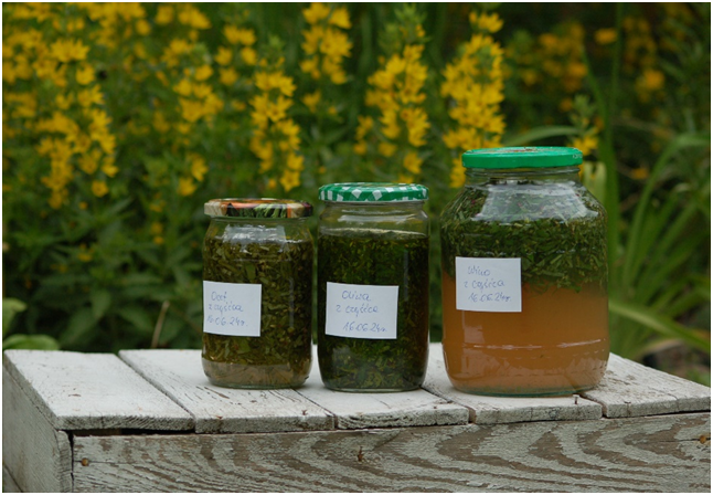 Nalewka :1 część najlepiej świeżego rozdrobnionego ziela zalać 3-5 cz. alkoholu 45-50%, odstawić na przynajmniej 7 dni. Zażywać 2-3 razy dziennie po 5 ml. Po rozcieńczeniu wodą 1:1 stosować do przemywania i płukanek.